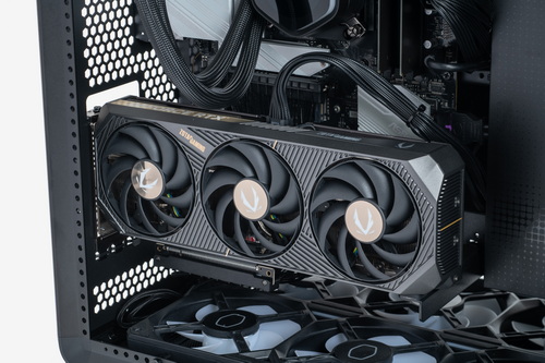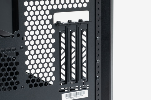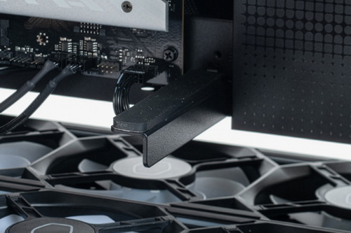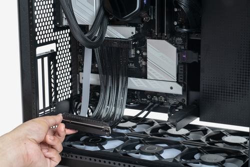 また、ケース背面側には標準的な拡張カード用ブラケットの口が開いておらず、ビデオカードは垂直設置専用の構造だ。まさに「見せる」をメインテーマとしたケースならではと言える思い切った設計だ。マザーボードとビデオカードをつなぐPCI Express 5.0 対応のライザーケーブルが付属しており、最新世代のGPUを利用する際でもパフォーマンスへの影響は最小限にとどまる。実際に試してみたところ、ベンチマークテストのスコアにはほとんど影響が見られず、よほどシビアに意識するのでなければ、ほぼ気にする必要はない、もしくは見た目とのトレードオフと割り切れる範囲、と言ってよさそうだ。