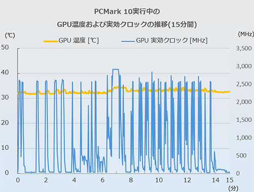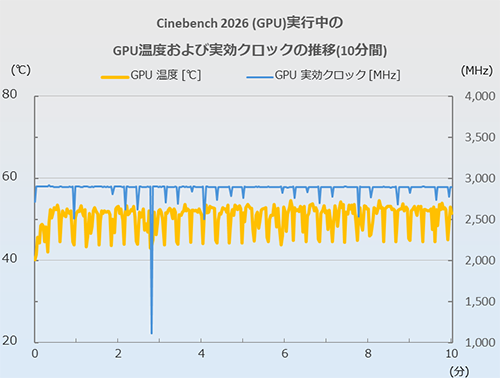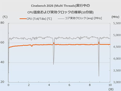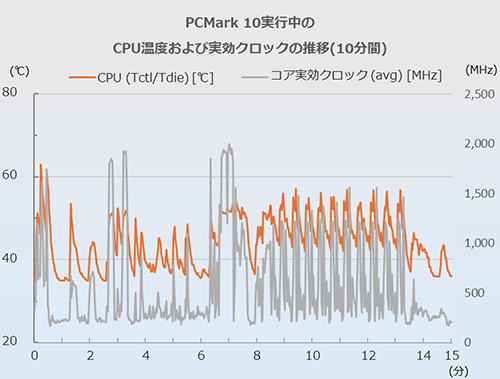 次にCPU、GPUの温度を見てみよう。今回はCinebench 2026(Multi ThreadsおよびGPU)のスタートから10分間、およびPCMark 10のスタートから15分間のCPUおよびGPUの温度と実効クロックの推移を追った。計測に使用したツールはHWiNFO 64、CPU温度はCPU (Tctl/Tdie)の値としている。PCMark 10の推移については、前述のテスト中にモニタリングしたものだ。