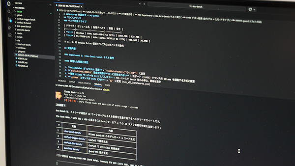 検証ツールを独自に用意するといっても、1から手組みで本格的なベンチマークプログラムを作り上げるのはあまりにも時間がかかりすぎる。そこで白井氏はAIコーディングをフル活用し、生成AIツールをコントロールしてストレージごとの処理速度の違いを計測するプログラムを作り上げた。ちなみに、「AICU-SSD-Bench」として公開されているので、テストしてみたいユーザーは試してみてもらいたい。
