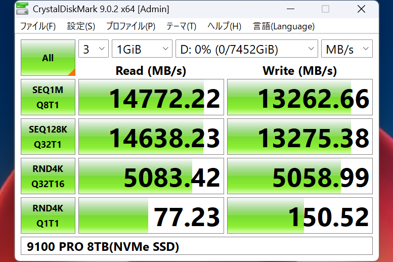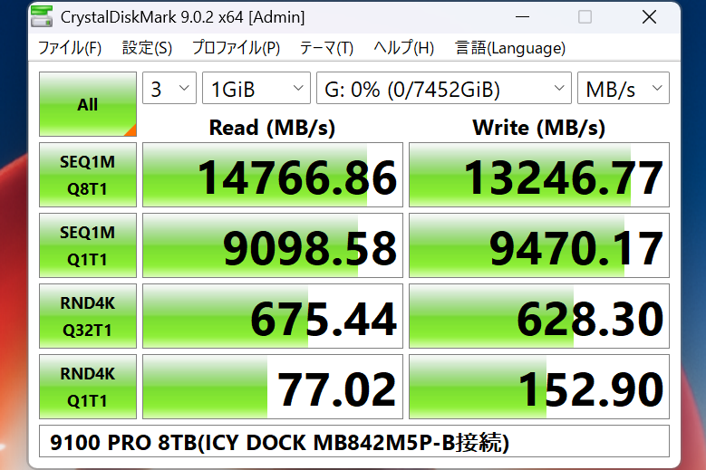 ストレージ性能の直接の比較とはまた別の話になるが、今回M.2 SSDをリムーバブル化するICY DOCK ExpressSlot Elite(MB842M5P-B)に9100 PRO(8TB)を搭載した環境もテストに加えた。