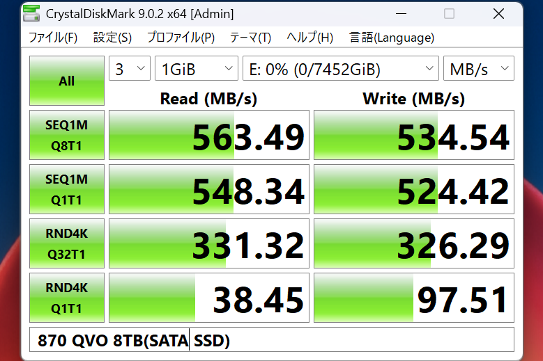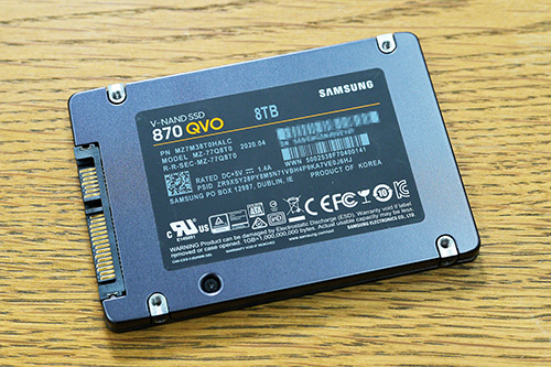 AI用途での性能比較にはSamsung 9100 PRO SSD 8TB(以下9100 PRO)、Samsung 870 QVO SSD 8TB(以下870 QVO)、3.5インチHDD 8TBを用意した。最速クラスのNVMe SSDに、標準的なSATA SSDとSATA HDDの3パターンで性能差が出るのかを見てみたい。