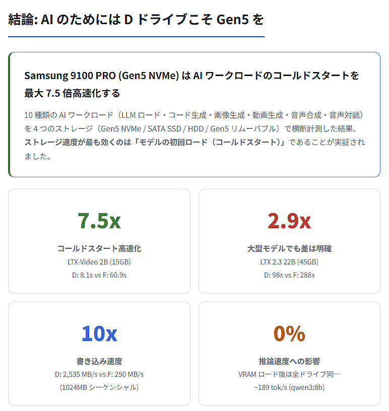 今回のベンチマークテストにより、AIモデルデータを9100 PROのような高速なSSDに保存することで、確かなパフォーマンス向上につなげられることが分かった。