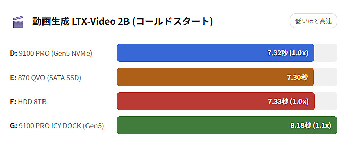 まずは小さめのAIモデルデータとなるデータサイズ15GBの「LTX 2B」で動画生成した際の結果から紹介するが、こちらはICY DOCK「ExpressSlot Elite接続の9100 PROが若干遅い結果となったが、ストレージ間で大きな差はなかった。
