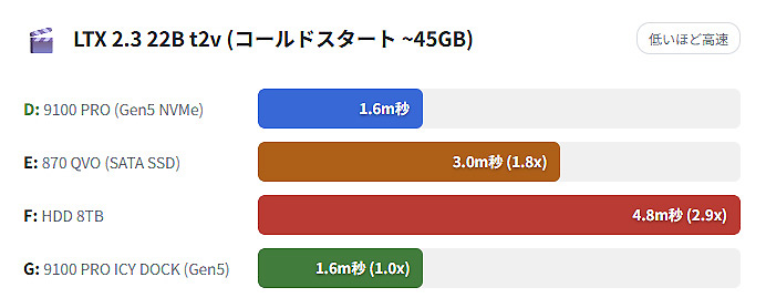 一方、データサイズ45GBのLTX 2.3 22BのAIモデルデータを使用した動画生成では、9100 PROがSATA SSDの870 QVOに対して約1.8倍、SATA HDDに対して約2.9倍も高速という結果になっている。