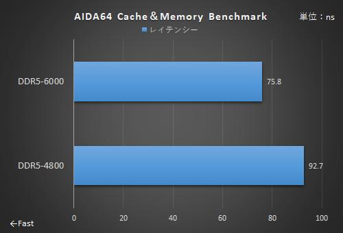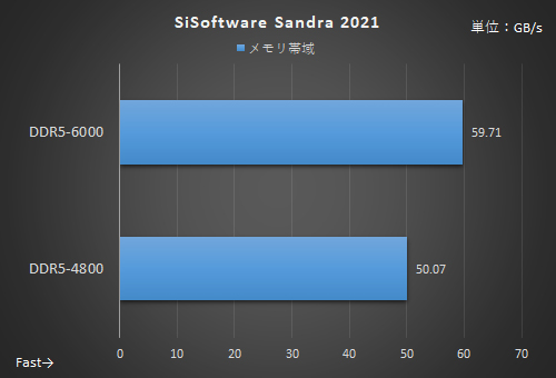 動作クロックが異なるため、当然ながらデータ転送速度には差が生まれる。AIDA64 Cache&Memory Benchmarkのライトでは約26%も向上、SiSoftware Sandra 2021のメモリ帯域でも約19%のアップを確認。レイテンシーも17~18%ほど短縮しており、レスポンスもよくなっているのが分かる。