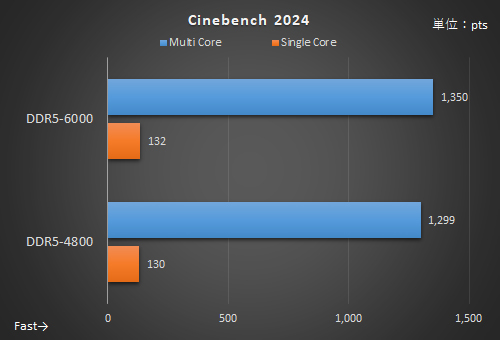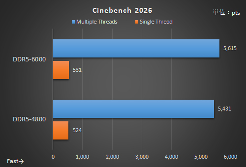 すべてのコアを使うCinebench 2026のMultiple Threadsで約3.4%、Cinebench 2024のMulti Coreで約3.9%のスコア向上を確認。CPU主体のテストでも高メモリクロックの効果は確かにある。