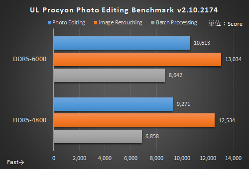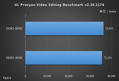 Photo Editing Benchmarkでは、主にLightroom Classicで処理を行い、CPU性能の影響が大きいBatch ProcessingではDDR5-6000のほうが約26%も高スコアになった。画像処理にもガッチリ効くと言ってよいだろう。Video Editing BenchmarkはGPUによるエンコードが中心になるため約1.9%差にとどまった。CPUが絡む処理のほうが影響が出やすいようだ。
