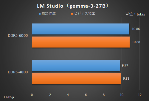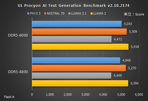 UL Procyon AI Text Generation BenchmarkはほぼGPUで実行される処理だ。そのため、最大でも約1.7%の差となった。若干の効果と言える。その一方でgemma-3-27Bは巨大モデルであるため、RTX 5080のビデオメモリ(16GB)には収まり切らず一部処理がメインメモリで行われるようになったことから、DDR5-6000のほうが10%以上も高速になっている。ただ、ビデオメモリに収まっていないため非常に低速だ。遅くても巨大なモデルを動かしてみたいという限定的な場面で効果があるという認識でよいだろう。