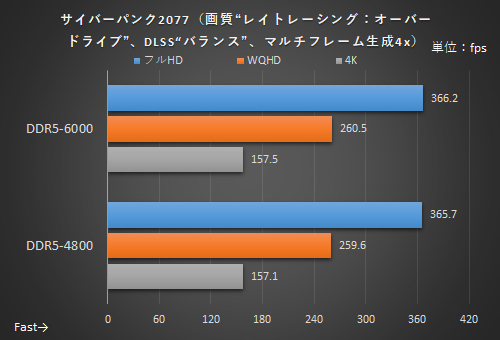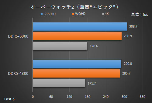 一般的な傾向として、CPUとGPUの負荷が低くなるフルHD解像度ではメモリの影響が大きく出る。ファイナルファンタジーXIVでは約3.8%、オーバーウォッチ2では約6.5%もDDR5-6000のほうが優秀だ。それ以上の解像度では、GPU負荷が高まるためメモリの影響が小さくなる。“ガチ対戦プレイ”を志向するゴリゴリのゲーマーがフルHDやWQHD解像度で限界までフレームレートを絞り出したい、といった場合には特に効果的だろう。