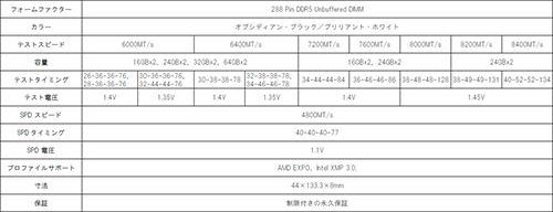 なお、オーバークロックメモリの性能を発揮するためには、マザーボードでUEFIメニューから設定プロファイルを読み込む必要がある。詳しくはこちらの記事で解説しているが、ESSENCOREブランドではAMD EXPOおよびIntel XMP 3.0に準拠したプロファイルを両方持っており、プラットフォームを気にせず選べるのも強みだ。さらに、各製品とも制限付きの永久保証が付いている。