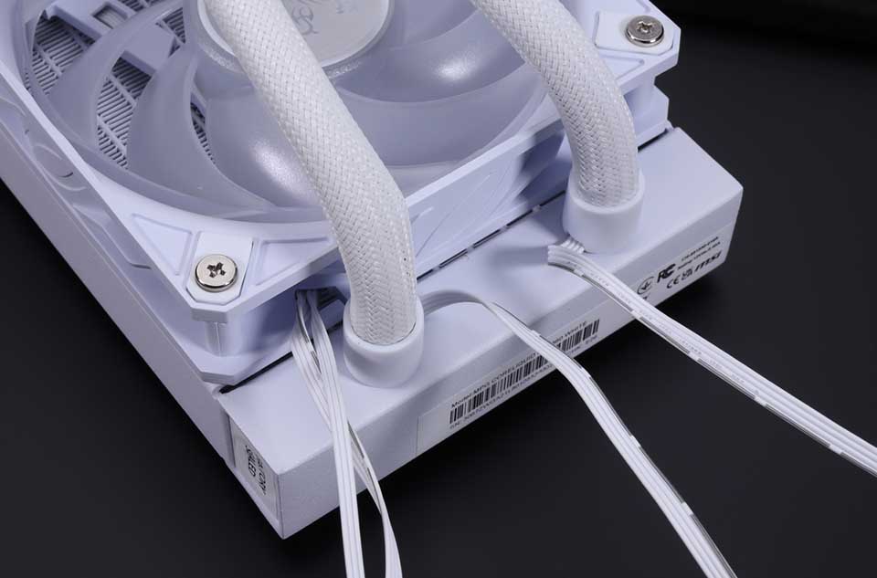 水冷ヘッド用のケーブルをウォーターチューブのスリーブ内に配線するStream Lineと、裏面でデイジーチェーン接続された冷却ファンの採用により、水冷クーラーの動作に必要なケーブルをラジエーター側に集約している。