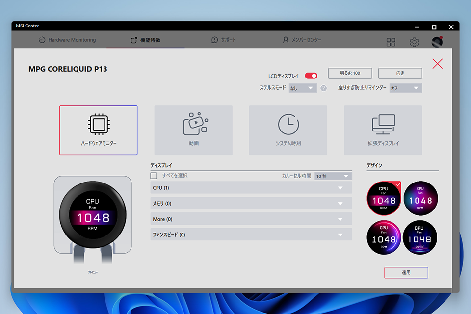 液晶パネルの解像度は480×480ピクセルで、最大輝度は600nits。液晶パネルの表示はMSIのユーティリティソフト「MSI Center」上のEZ Display機能でカスタマイズ可能となっており、ハードウェアモニターや動画再生、システム時刻などを表示できるほか、拡張ディスプレイとしてデスクトップ画面を表示することもできる。