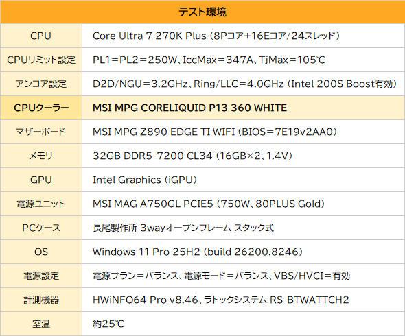 ここからは、最新CPU「Core Ultra 7 270K Plus」を使用し冷却性能をテストする。MSIのIntel Z890搭載マザーボード「MPG Z890 EDGE TI WIFI」に搭載したCore Ultra 7 270K Plusの動作設定は、電力リミットがPL1=PL2=250W、最大温度(TjMax)は105℃に標準で設定されている。