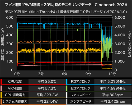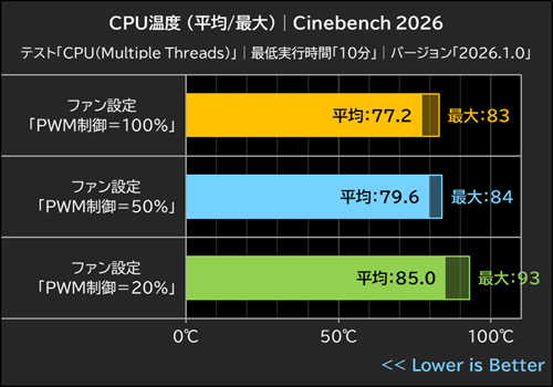 ファン速度ごとのCPU温度は、PWM制御100%が平均77.2℃(最大83℃)、PWM制御50%は平均79.6℃(最大84℃)、PWM制御20%は平均85.0℃(最大93℃)を記録。いずれも最大温度の105℃を下回る温度でCore Ultra 7 270K Plusを運用可能だった。
