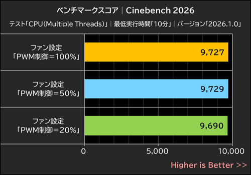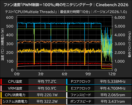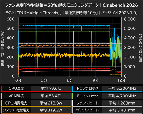 冷却性能のテストは、Cinebench 2026の「CPU(Multiple Threads)」で負荷をかけ、標準の最低実行時間=10分で実行中のモニタリングデータをHWiNFO64 Proで計測した。
