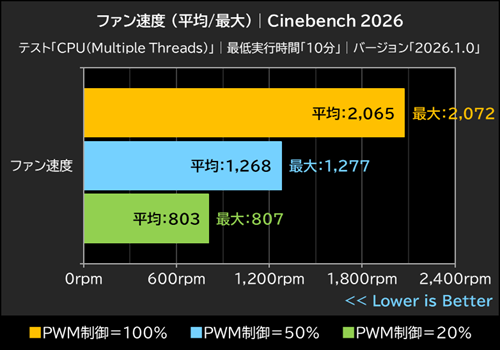 また、今回は冷却ファンのPWM制御を、100%、50%、20%の3パターンで計測。ポンプ速度についてはいずれの条件でもPWM制御=100%に設定している。