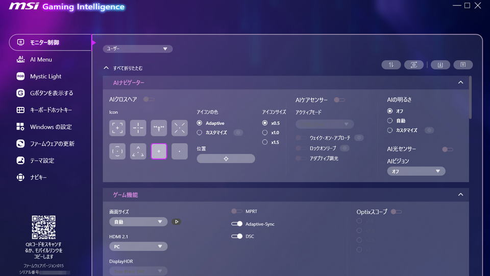 ゲーミングモニターらしい機能としては、定番のフレーム間に黒色を挿入してブレを軽減する「SLMB」(Supports Super Low Motion Blur)、暗部を明るくする「AIビジョン」、画面中央に照準を表示する「AIクロスヘア」、画面の中央を拡大する「Optixスコープ」を搭載する。これらの機能は、OSDメニューによる設定のほか、Windows向けの「Gaming Intelligence」アプリでも設定可能だ。