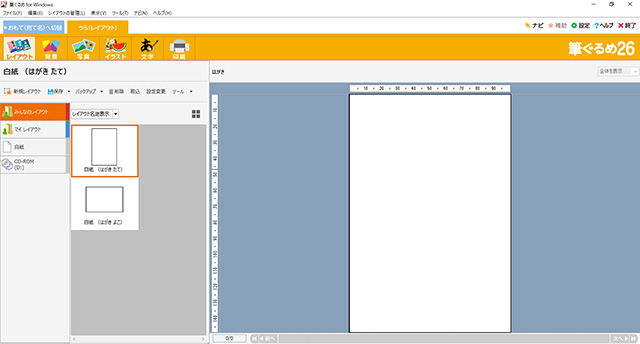 イラストやあいさつ文を印刷する裏面を作成するには、メニュー画面の[筆ぐるめを使う]をクリックし、ハガキ面の編集機能を呼びだそう。一番上のタブにある[うら(レイアウト)]をクリックし、さらにその下のタブの[レイアウト]から、作成したい年賀状の体裁(レイアウト)を決める。