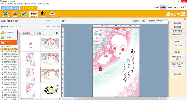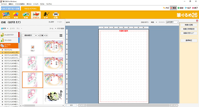 ここでは横か縦かを選択する。作りたい年賀状のイラストに合わせて選択しよう。今回は縦を選択した。次は2番目のタブにある[イラスト]をクリックする。その状態で左側にある[CD-ROM](実際にはDVDドライブに入っているDVD-ROM)をクリックし、気に入ったイラストが収録されているフォルダを開こう。