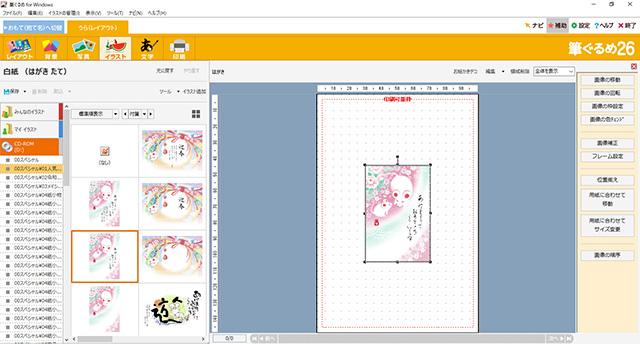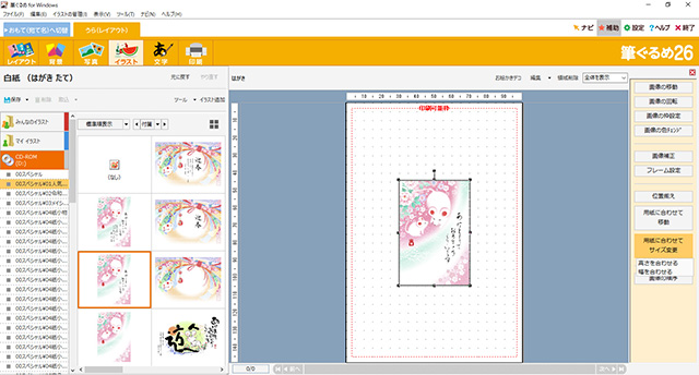 目的のイラストを見付けたら、それをダブルクリックする。すると右側のハガキウィンドウに、そのイラストが表示される。この状態では中央に小さく表示されるだけなので、右側にある[用紙に合わせてサイズ変更]ボタンから画像サイズの調整を行なう。[高さを合わせる]と[幅を合わせる]という二つの選択があるが、どちらを選んでも結果はほとんど変わらない。