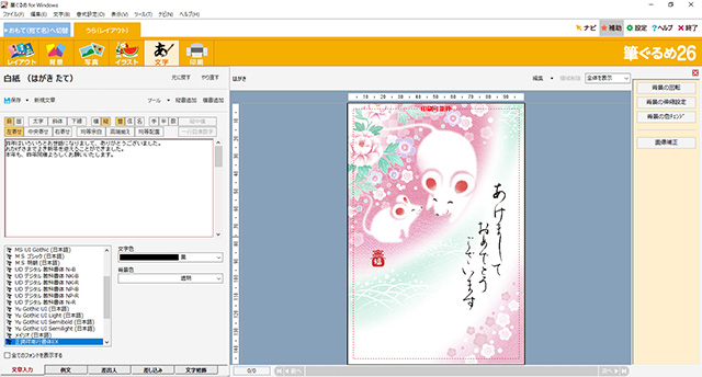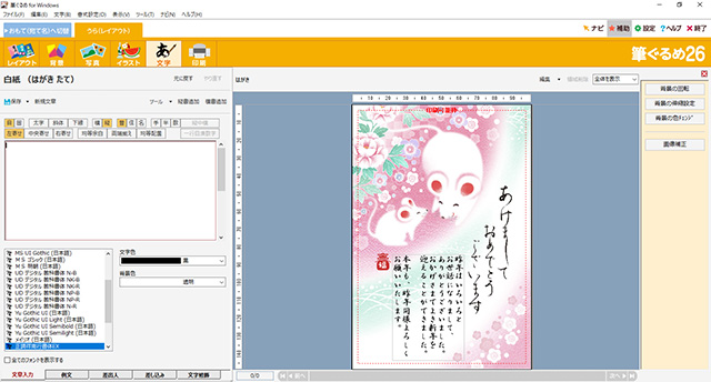 これでイラストの張り込みは終わった。さらに余ったスペースにテキストを入れていこう。[イラスト]の右にある[文字]タブをクリックすると、文字の入力エリアとフォントを設定する画面が表示される。ここから、自分の近況やあいさつ文などを入力していく。