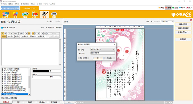 ファイルメニューの[ファイル]から[新規レイアウトとして保存]をクリックして表示されるダイアログで、[レイアウト名]に忘れないように[2020年年賀状]などと入力して[OK]ボタンをクリックする。