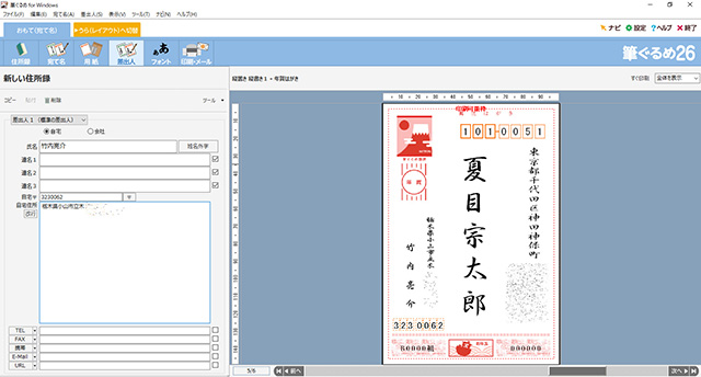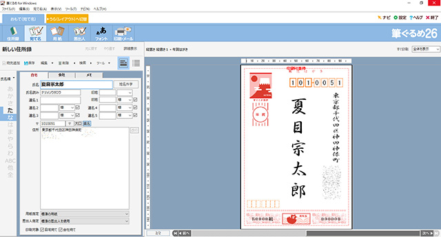 [新しい住所録]をクリックして住所録のファイル名などを入力すると、住所録の作成画面が表示される。[氏名][住所]など、それぞれのダイアログに合わせた項目を埋めていこう。すると右側のあて名面の表示画面で、入力したテキストがどう表示されるかを確認できる。