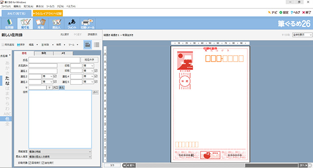 次にあて名面の作成を行なう。ファイルメニューの下にあるタブの[おもて(宛て名面)へ切り替え]をクリックしよう。まずは住所録を作って、年賀状を出す相手の住所などを登録していく。