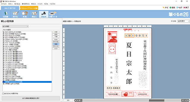 あて名面のフォントも変更できる。[差出人]の右にある[フォント]をクリックすると、PCにインストールされ、年賀状に利用できるフォントの一覧が表示される。それぞれのフォント名をクリックすると、そのフォントを利用した場合の印刷結果を右のウィンドウで確認できる。