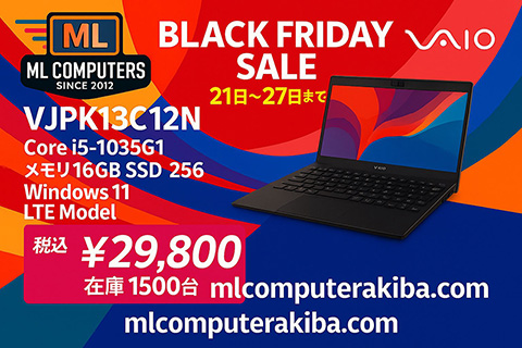 Core i5-1035G1(4コア/8スレッド)を搭載した13.3インチノートPC「VJPK13C12N」の中古品が、ML COMPUTERSの通販サイトで期間限定セール中。セール期間は11月27日(木)まで。