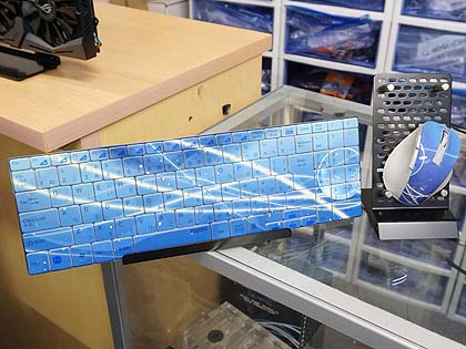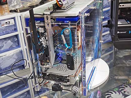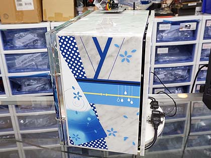 過去に「クレセントPC」を製作したsaito氏の作品で、大理石+アクリル板でできたオリジナルのPCケースを採用。大理石やアクリル板には水晶雫のイラストや着物を意識したデザインがプリントされています。また、同PCにあわせたキーボードとマウスも展示中。