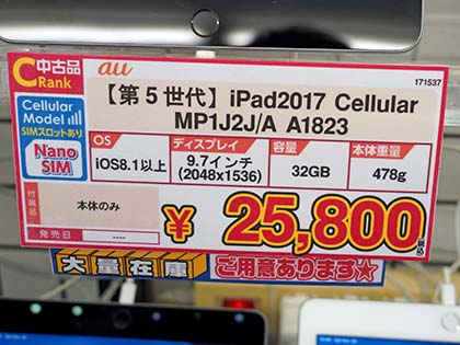 iPad 2017年セルラーモデルが税込25,800円で大量入荷、Cランク品セール