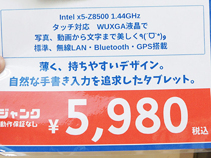 店頭POPによると主な仕様は、ディスプレイサイズが10.1インチ(解像度は1,920×1,200ドット)、CPUがAtom x5-Z8530、メモリ4GB、ストレージ 64GB SSD、OSはWindows 10。無線LANやBluetooth、GPS機能なども備えているそうです。