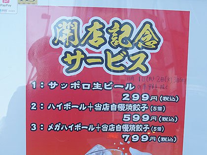 オープンを記念して、11月末までは生ビールを299円、ハイボール+自慢の焼き餃子5個を599円、メガハイボール+自慢の焼き餃子5個を799円で提供中。