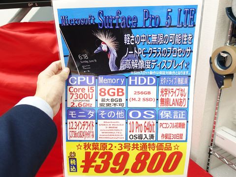 Microsoft製12.3インチタブレット「Surface Pro」の第5世代モデルが、PCコンフル 秋葉原2号店とPCコンフル 秋葉原3号店で10日(金)からセール予定。保証30日の中古品で、店頭価格は39,800円。在庫数は合計15台。