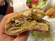 さて、同店の通常メニューについては、まんがを読んでいただくとして、このバーガーのポイントは「石橋のビーフパティ、三井製パン舗のバンズ、荒木商店の卵を使用したタルタルソース、アキバにある“構 雄三商店”のはんぺんを使用」という「ご当地」ぶり。そして、中でも特徴的なのが「はんぺん入り」な点。