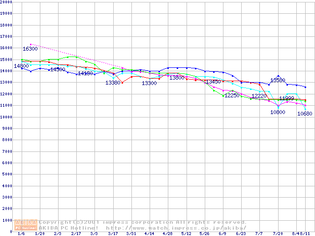 | [↑前グラフ]: | HDD 20GB~30GB未満(7,200rpmクラス)の最安値推移 |