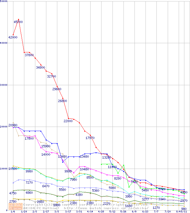 メモリ主要製品(最安値5千円未満)の最安値推移