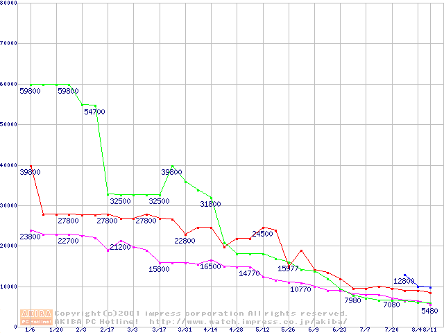 メモリ主要製品(最安値1万円以上)の最安値推移