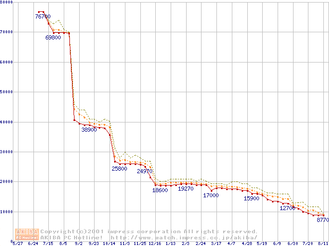 Socket A (Thunderbird,PGA,FSB 200MHz,L2 256KB)の最安値推移