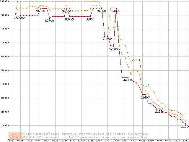 メモリ主要製品(最安値1万円以上)の最安値推移