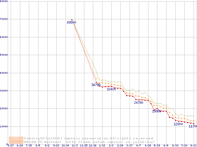 Socket A (Thunderbird,PGA,FSB 200MHz,L2 256KB)の最安値推移