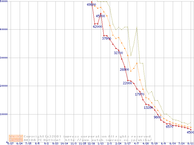 メモリ主要製品(最安値5千円未満)の最安値推移