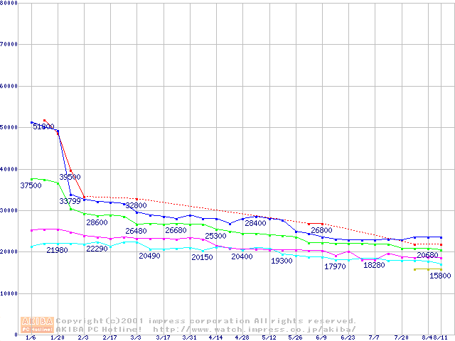 | [↑前グラフ]: | Socket 370 (FC-PGA2,FSB 133MHz,L2 256KB)の最安値推移 |