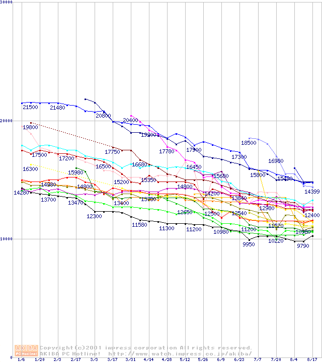 HDD主要製品(最安値1万5千円~2万円未満)の最安値推移