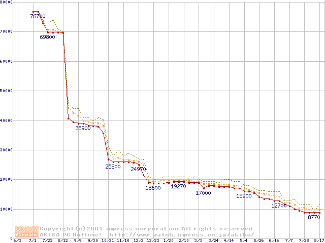 Socket A (Thunderbird,PGA,FSB 200MHz,L2 256KB)の最安値推移