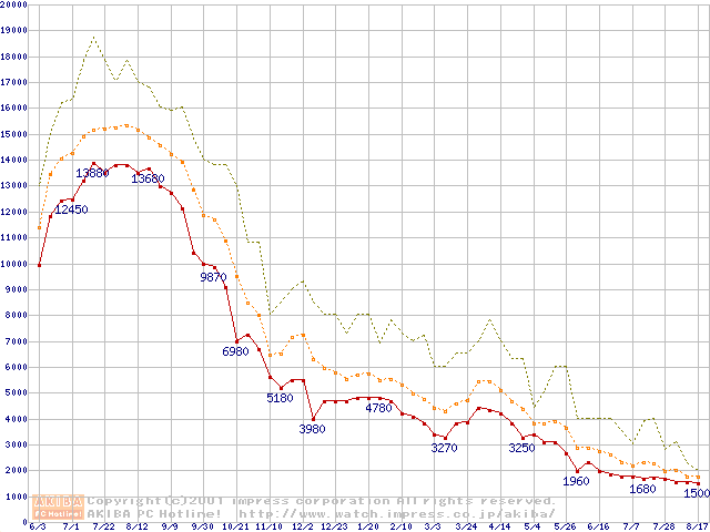 PC100 SDRAM DIMM CasLatency=2の最安値推移