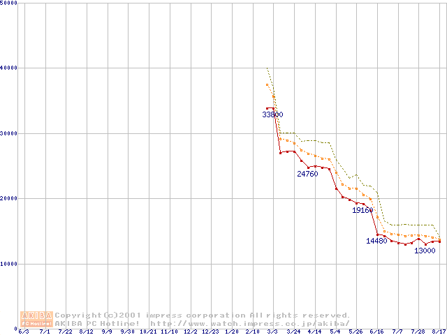 Socket A (Thunderbird,PGA,FSB 266MHz,L2 256KB)の最安値推移