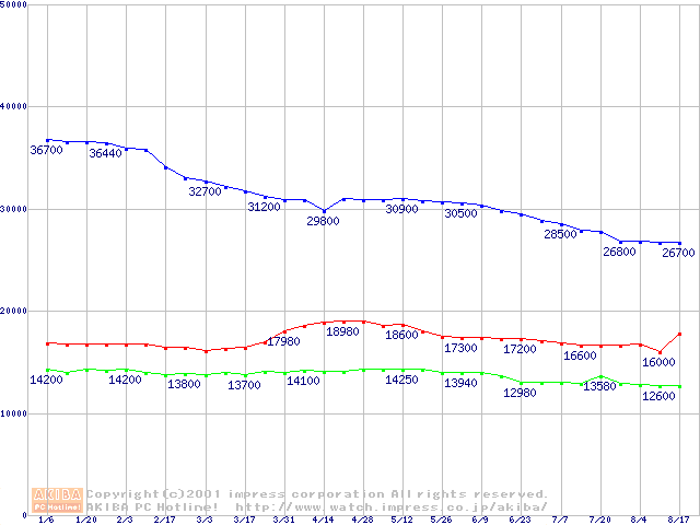 | [↑前グラフ]: | Deskstar 60GXP (7,200rpm Ultra ATA/100 2MB)の最安値推移 |