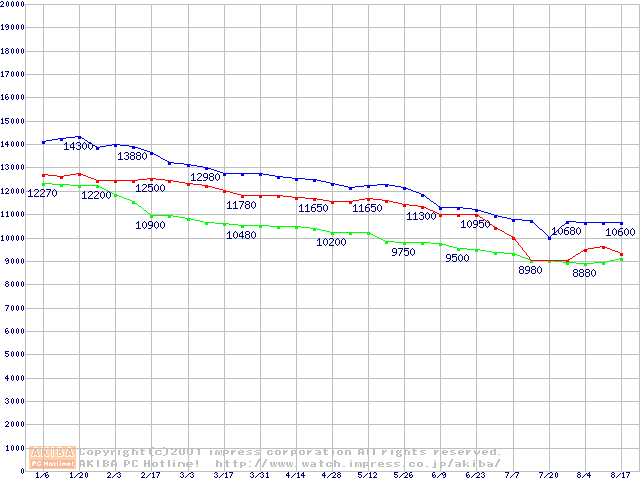 | [↑前グラフ]: | Deskstar 75GXP (7,200rpm Ultra ATA/100 2MB)の最安値推移 |